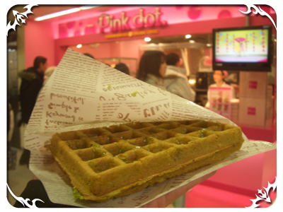 想起自己未吃東西,又見到有一處賣waffle的鋪頭,於是叫了一個宇治抹茶~